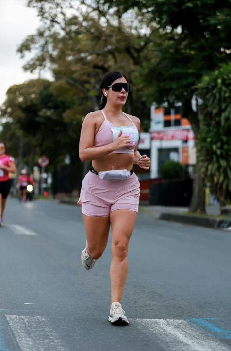 A person with brown hair wearing sunglasses, a pink bra, and pink shorts running on the road.